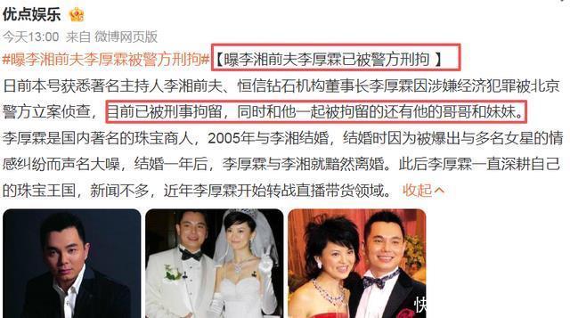 该博主爆料,著名节目主持人李湘的前夫,恒信钻石机构的董事长李厚霖,因涉嫌经济犯罪,被北京警方立案侦查。同时被刑拘的还有他的哥哥和妹妹。可以说是被一锅端了。